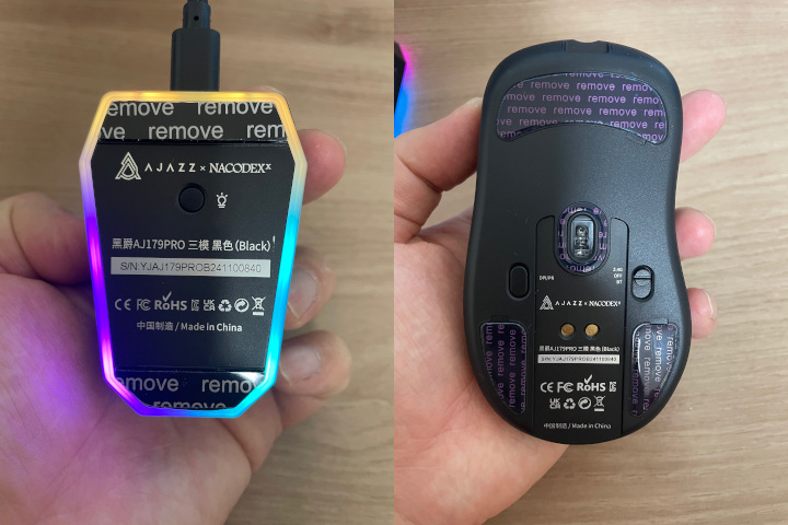리시버를 연결하면 리시버에 led에 불이 들어오고, 마우스 바닥에는 보호 필름이 붙어 있지만 전 제거 하지 않고 사용했습니다.